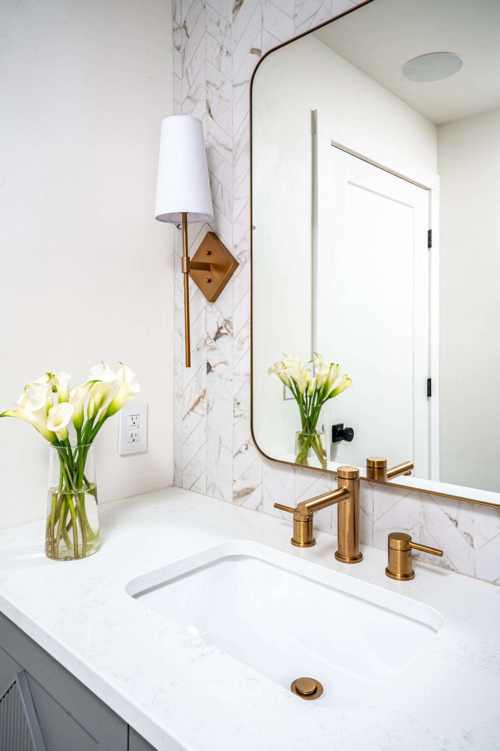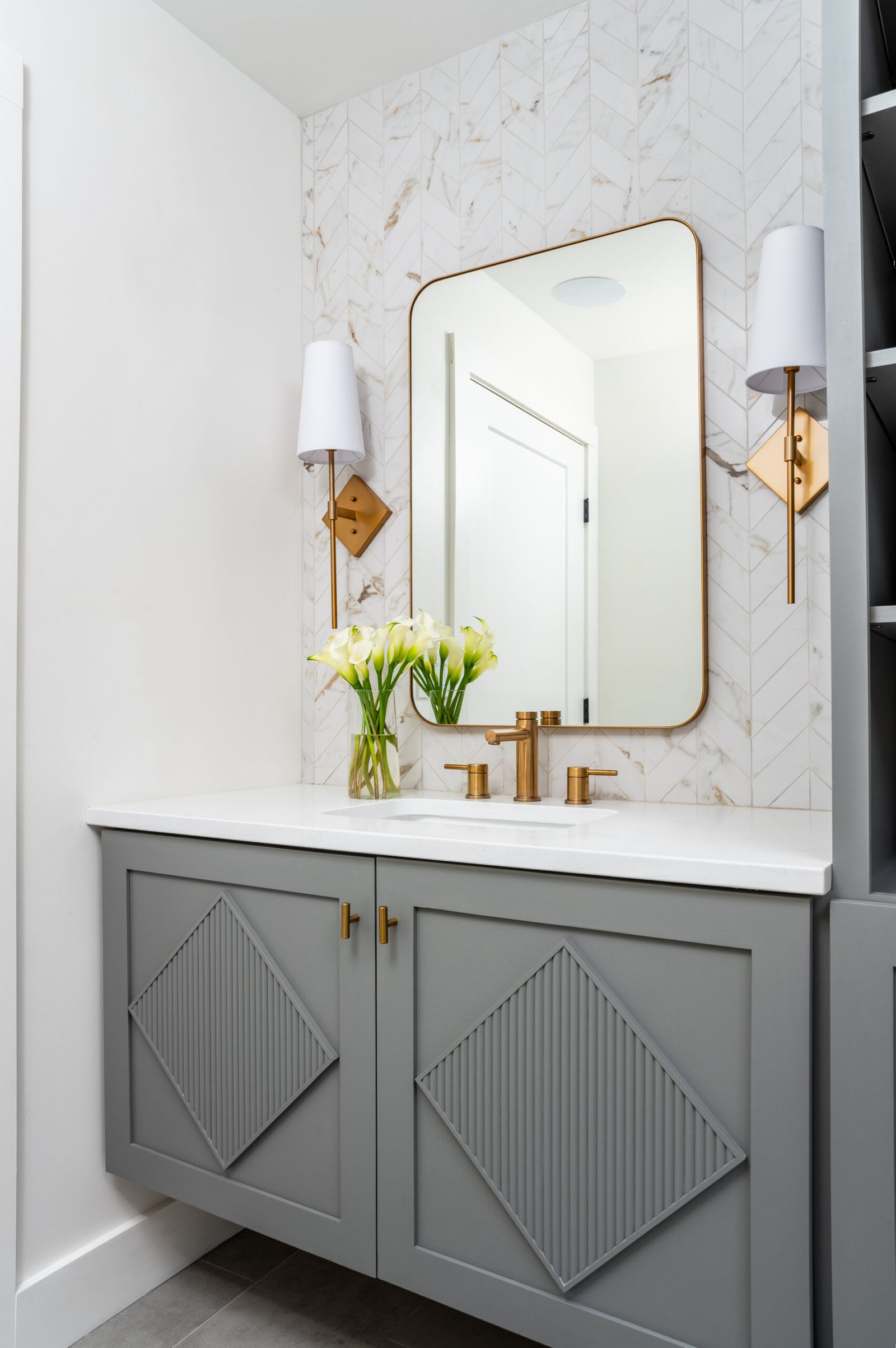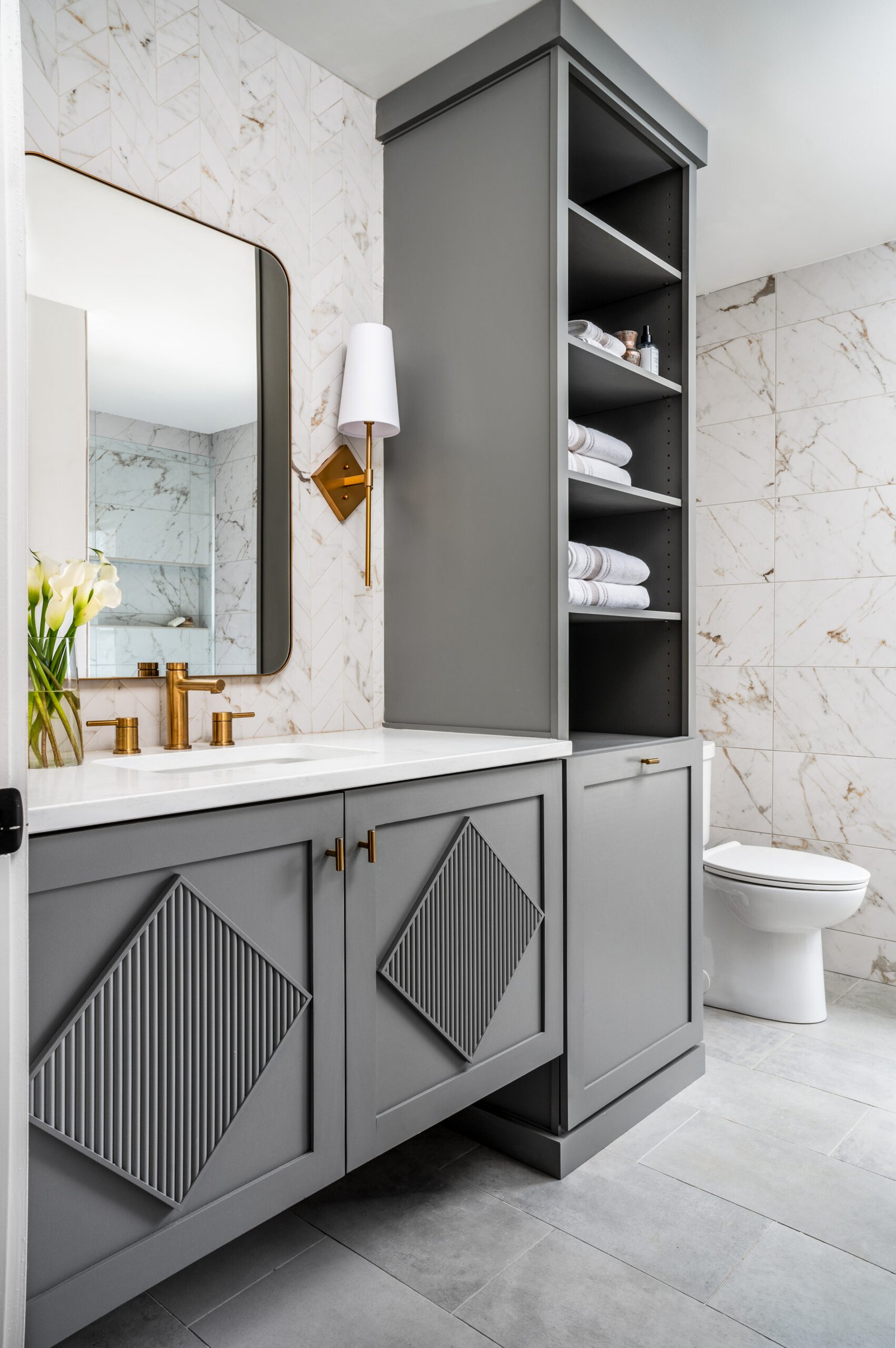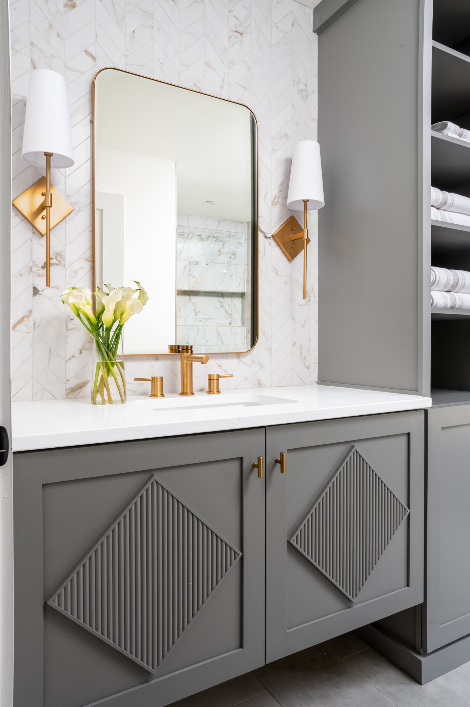 The clients’ desire for this bathroom was to design a space for their young daughter, that was elegant yet functional for a young girl, to grow into over the years. With this in mind, we added in a walk-in shower, with flush mosaic flooring (to mitigate slip risk), frameless tempered glass with brushed brass detailing in the hardware, and a large linear niche for storage. The walls of the shower, and surrounding walls were covered with 12×24 gold calacatta porcelain tile. For the bespoke millwork and toilet area, we included a floor to ceiling backsplash in a chevron patterned gold calacatta porcelain tile. In the middle storage unit, we integrated open-shelving, with a built-in, pull-out laundry unit in the lower area. The diamond-shaped reeded design in the door panels, speaks to the diamond-shaped base of the wall sconces on each side of the mirror. Brushed brass plumbing fixtures and hardware were added to create a timeless, glam feel.