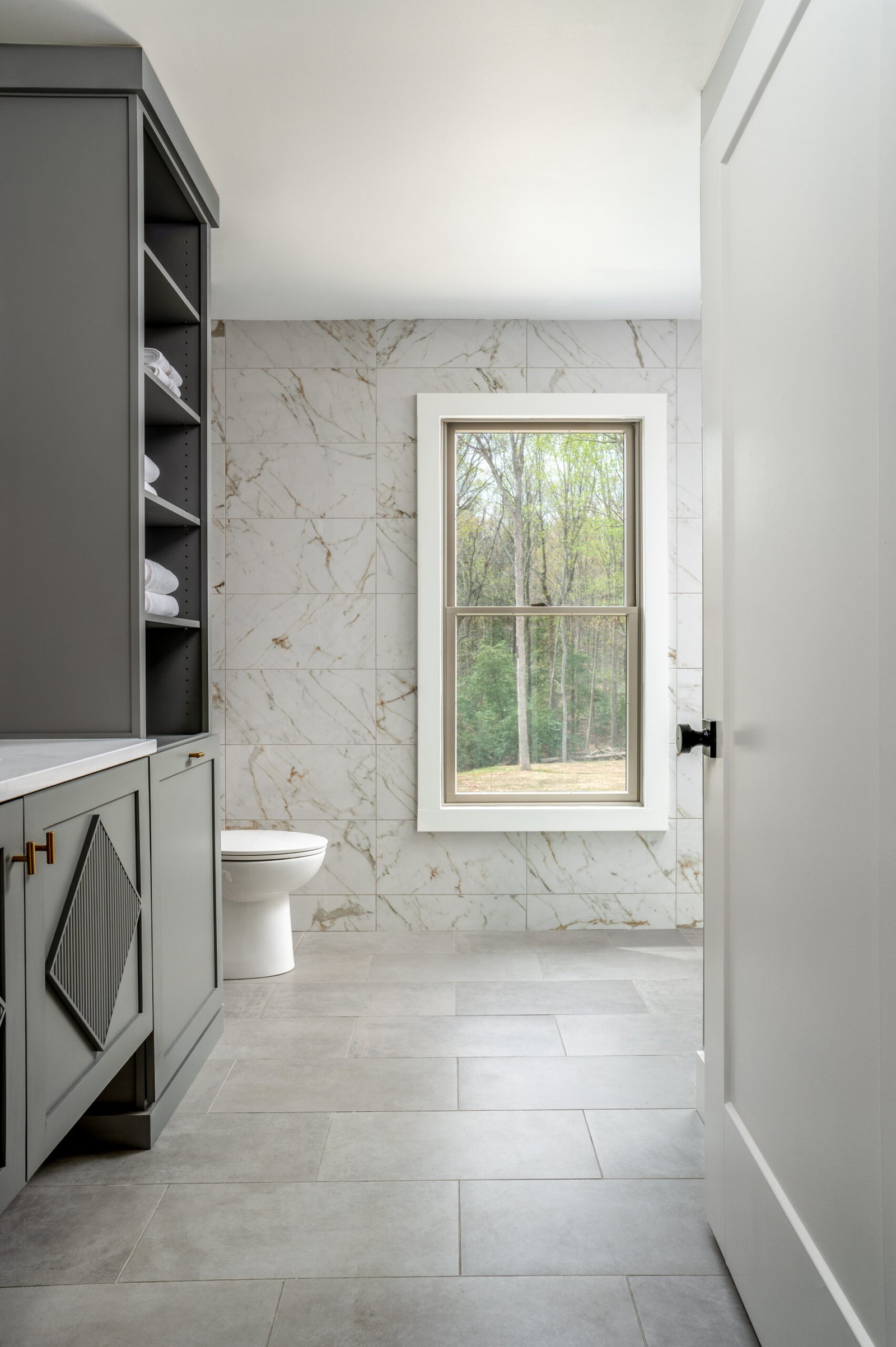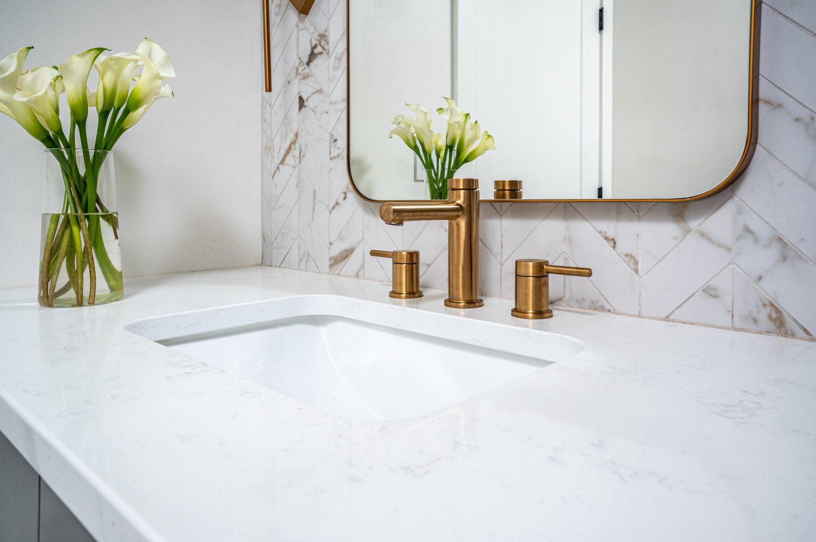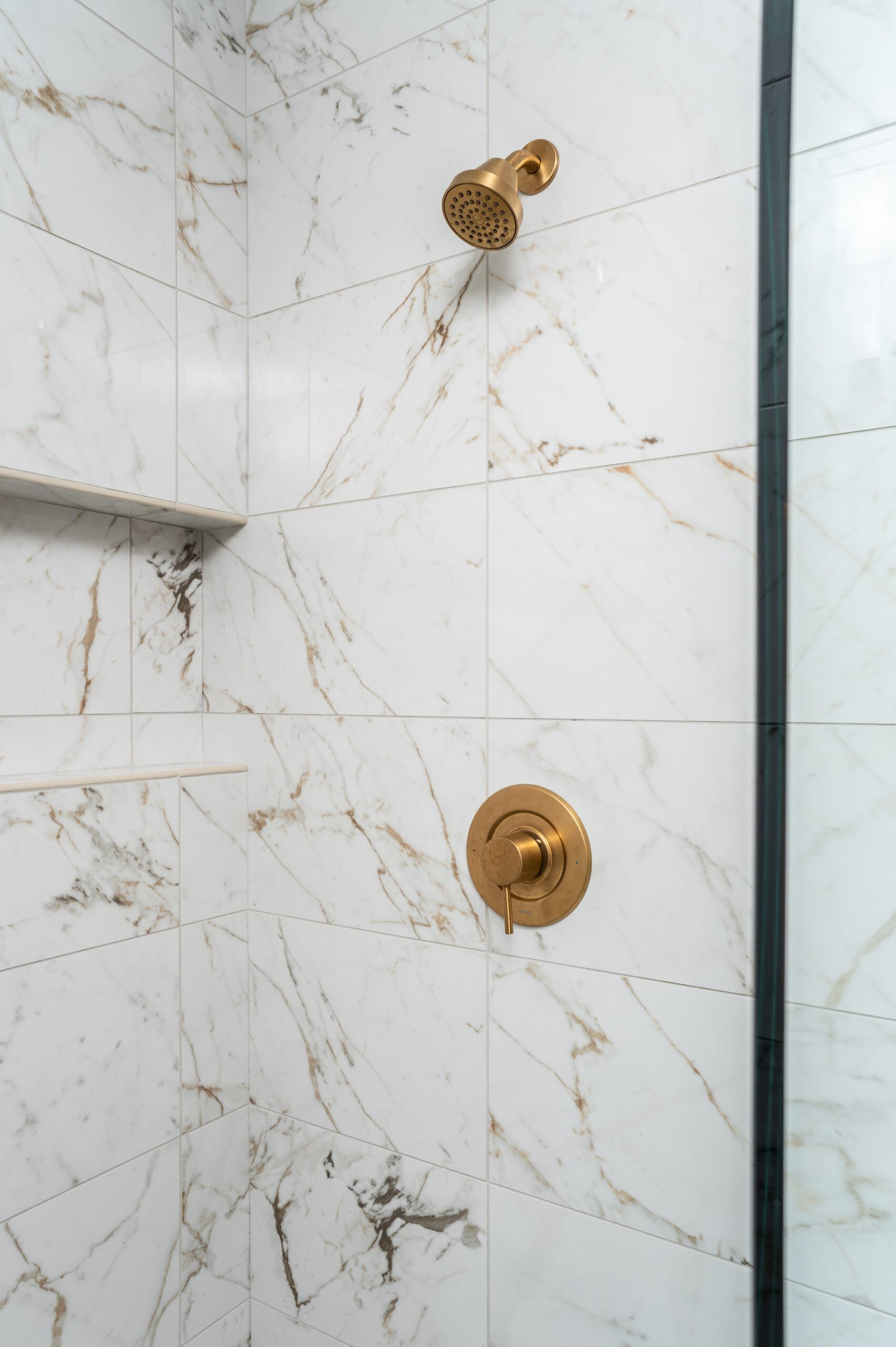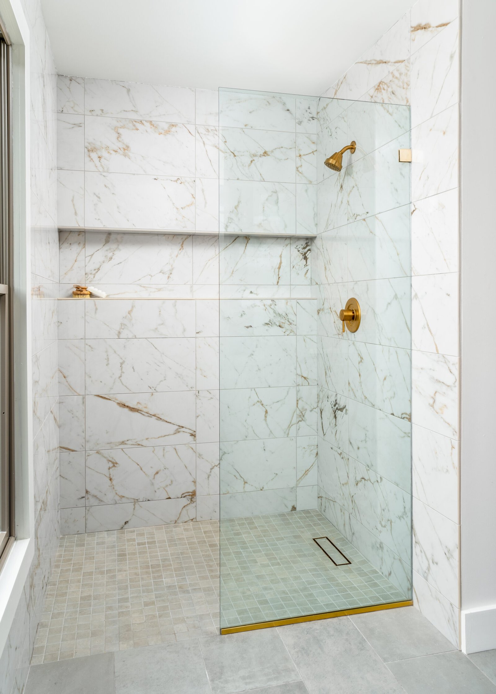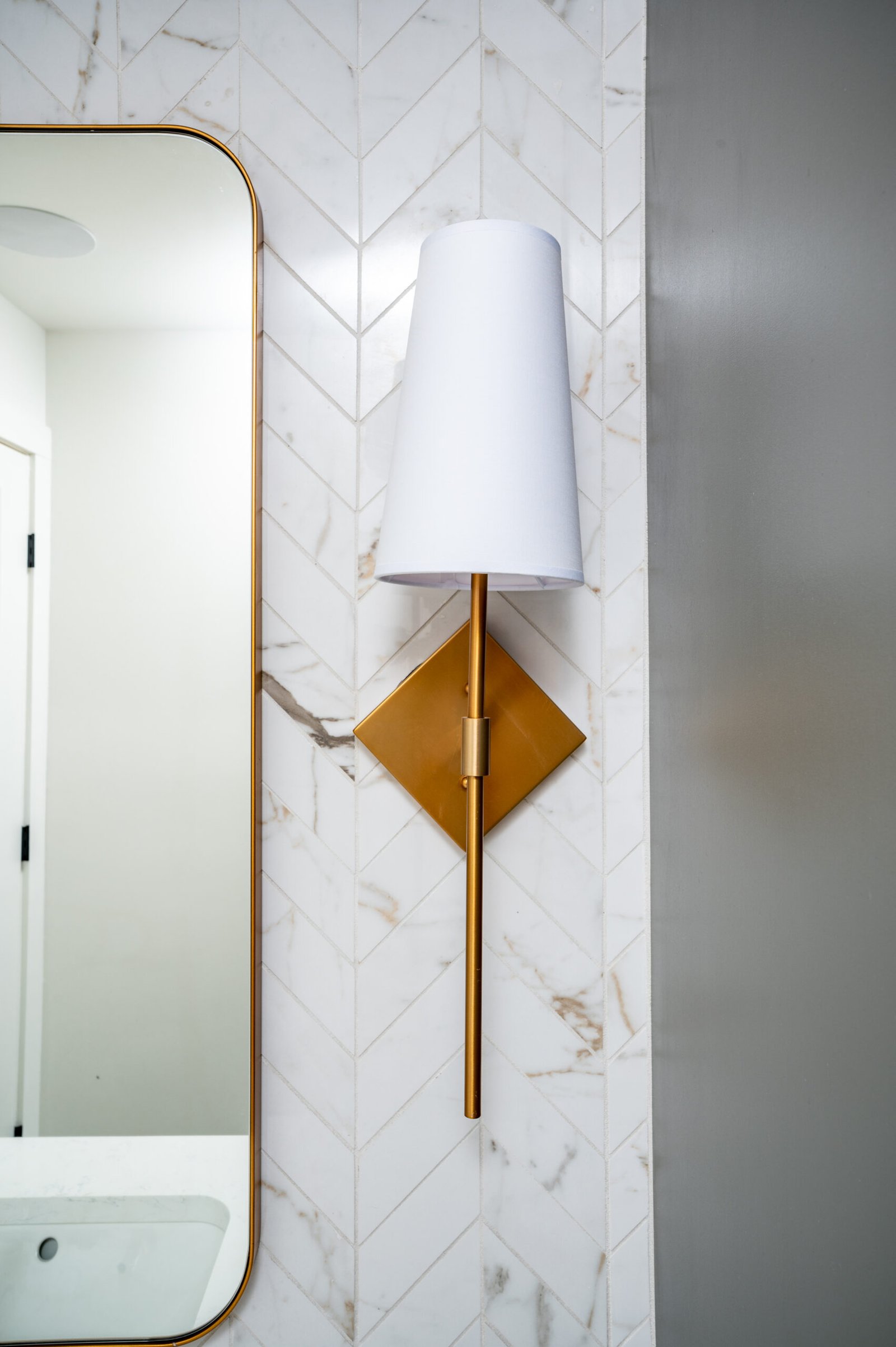 The clients’ desire for this bathroom was to design a space for their young daughter, that was elegant yet functional for a young girl, to grow into over the years. With this in mind, we added in a walk-in shower, with flush mosaic flooring (to mitigate slip risk), frameless tempered glass with brushed brass detailing in the hardware, and a large linear niche for storage. The walls of the shower, and surrounding walls were covered with 12×24 gold calacatta porcelain tile. For the bespoke millwork and toilet area, we included a floor to ceiling backsplash in a chevron patterned gold calacatta porcelain tile. In the middle storage unit, we integrated open-shelving, with a built-in, pull-out laundry unit in the lower area. The diamond-shaped reeded design in the door panels, speaks to the diamond-shaped base of the wall sconces on each side of the mirror. Brushed brass plumbing fixtures and hardware were added to create a timeless, glam feel.