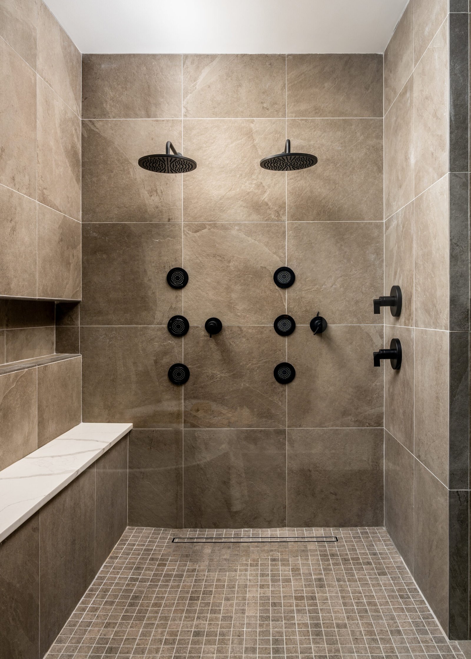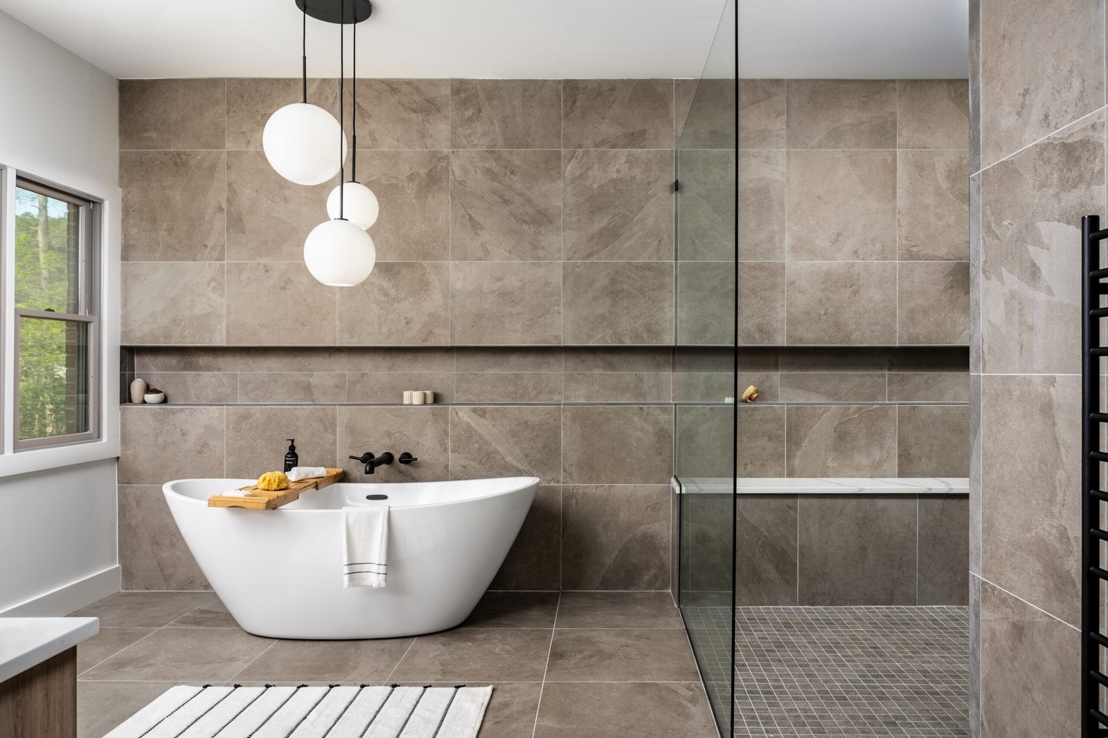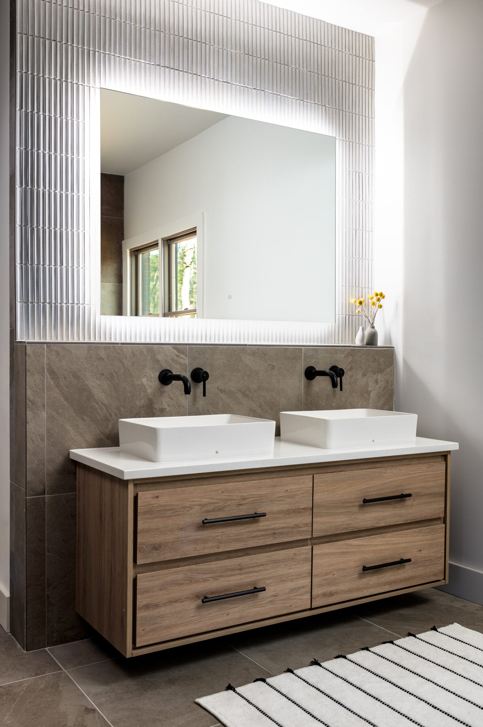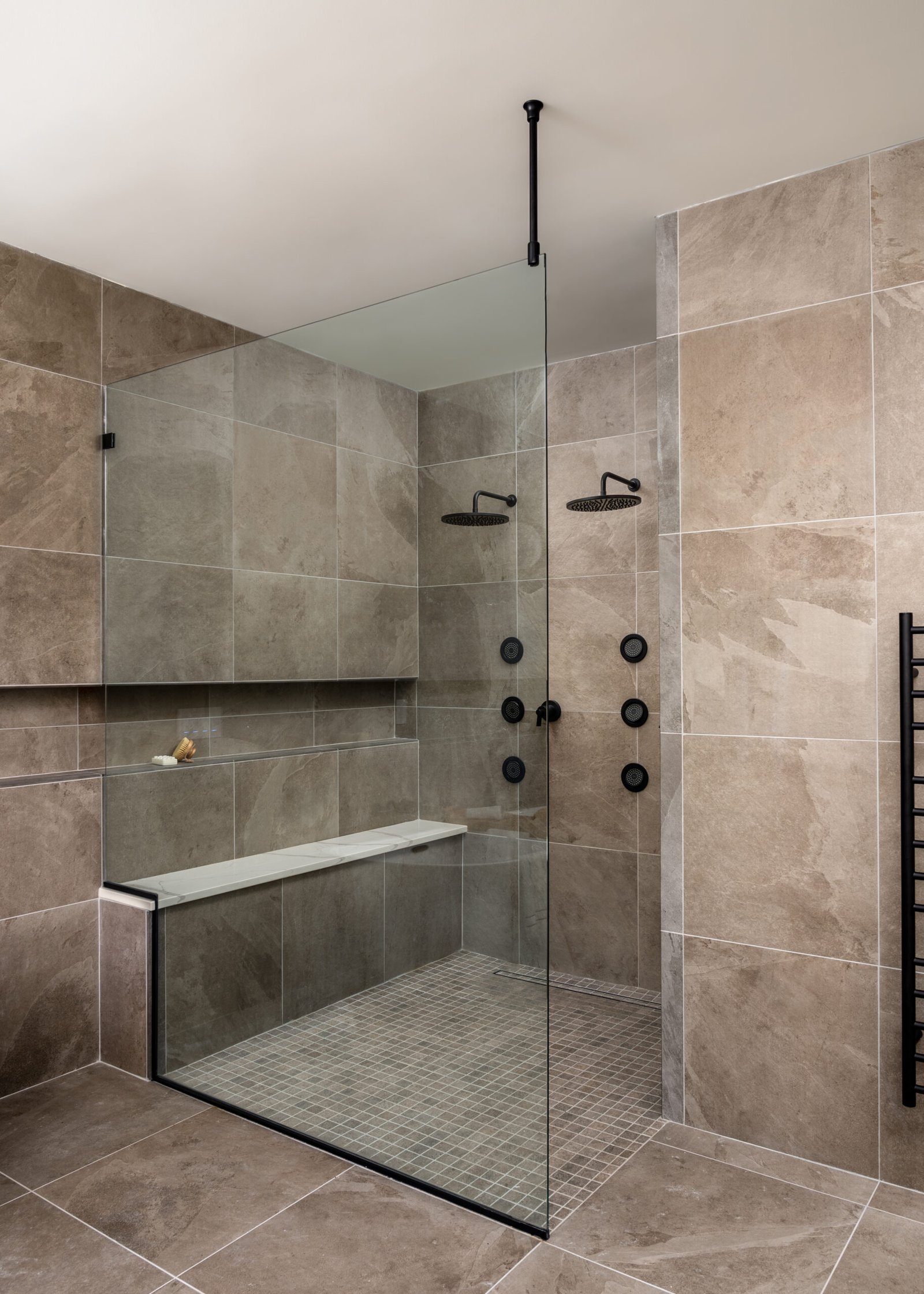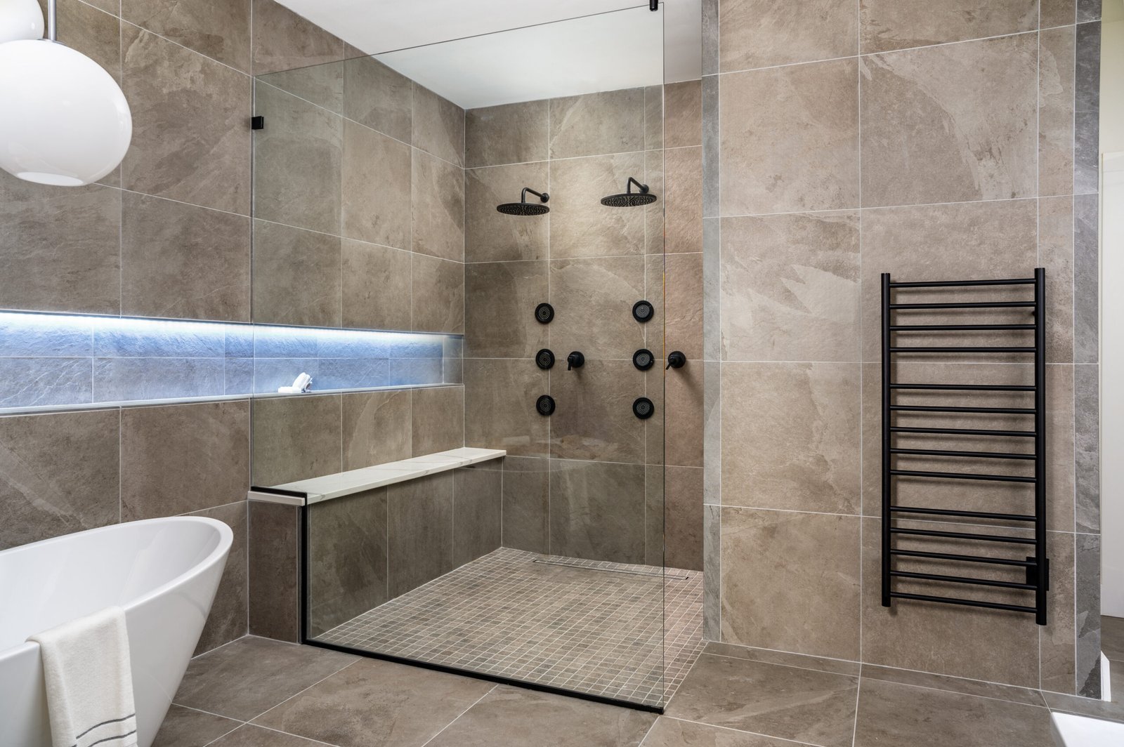The concept of this primary bathroom was rooted in the clients’ desire to have a spa-like feel throughout the area, with a modern flair. Following demolition, we added a touch of wood [with the floating vanity] to create a warmth, to break-up all of the neutral colored tiles, that we added in on the flooring, and walls. The canvas for the vanity mirror was a 1×8 speckled, vertical stacked tile, to add an organic element into this area, and break-up the monochromatic feel of the neutral-colored tile. Vessel porcelain sinks and matte black plumbing fixtures were added in the vanity area, as well as in the freestanding tub, and shower area. In the wall-to-wall linear niche, we integrated color-changing LED lighting that was able to be controlled remotely. In the shower, the clients requested two shower heads, and body-sprays to create the spa-like effect that they desired. The bench has a quartz top, that is integrated into the frameless tempered glass. We included a matte black towel-warmer on the wall, to add to the spa-like feel of the area.
