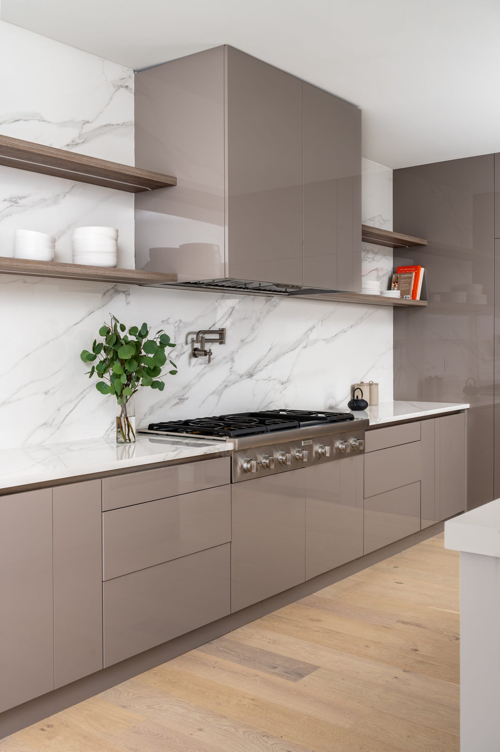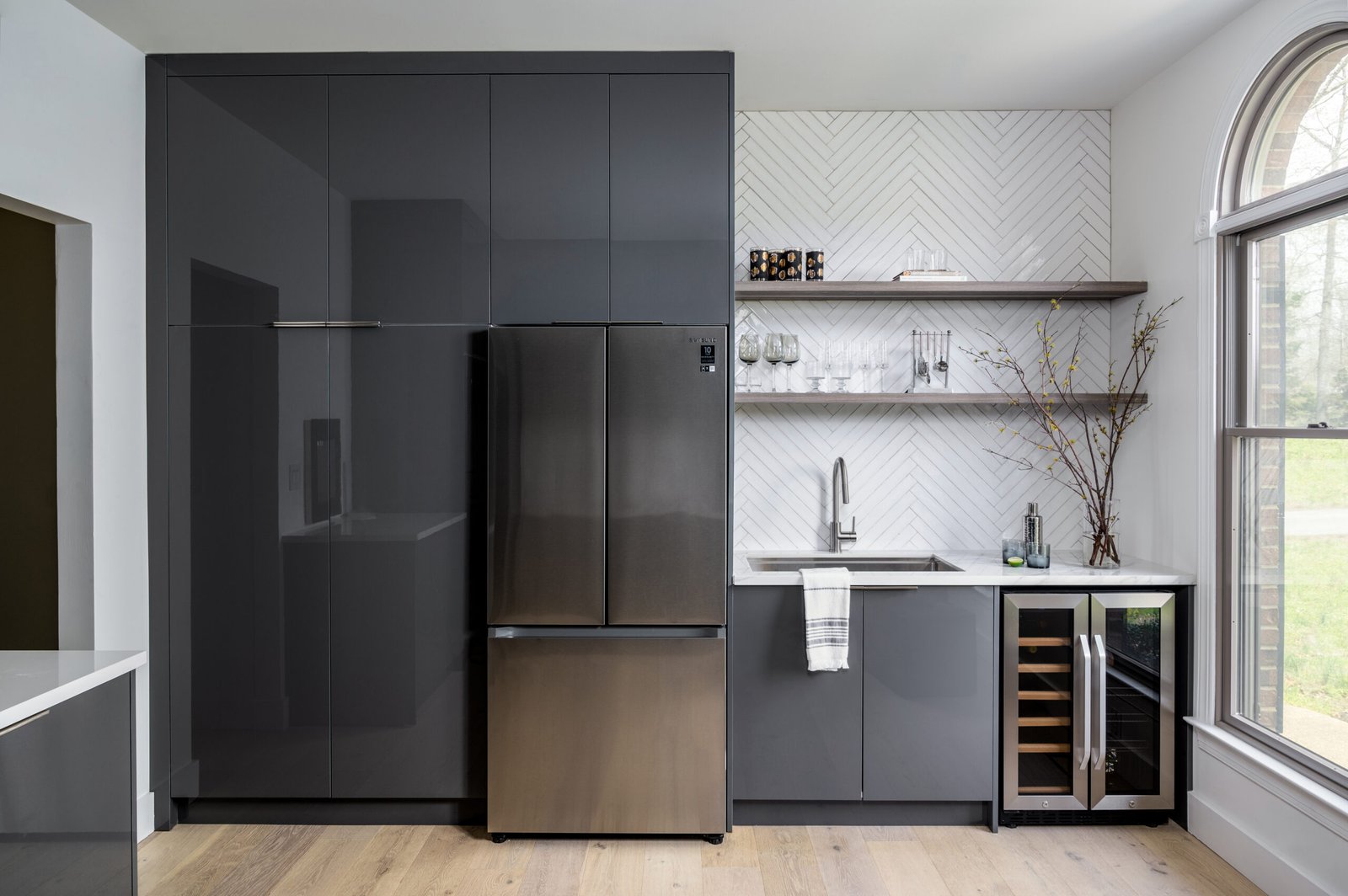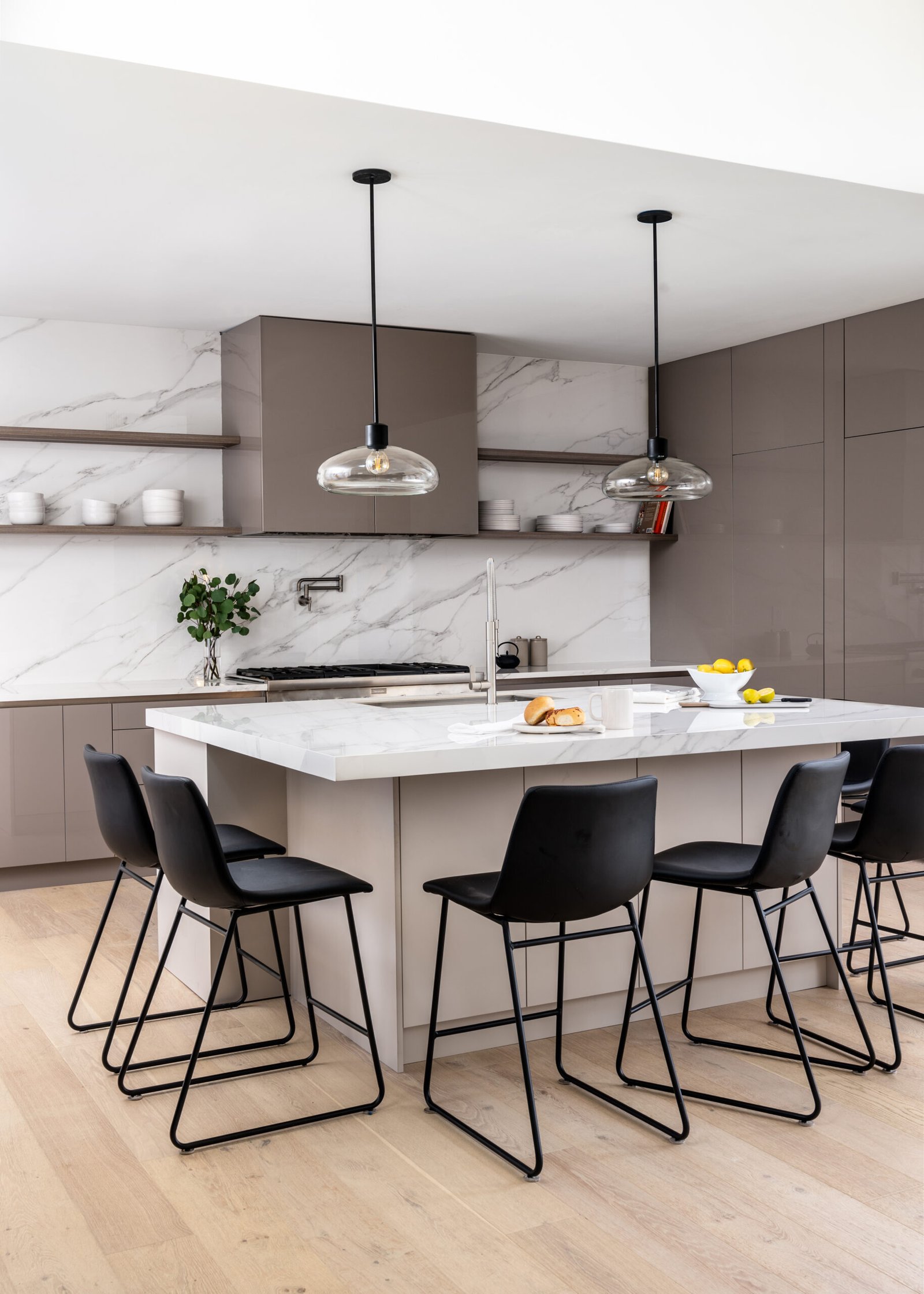 The clients’ desire was to change around the entire layout of the existing kitchen and neighboring dining room, into a kitchen that had an “open area”, and a “hidden area”, with a speak-easy style, flush door that was integrated into a wall, to appear as a panel, which led into the “hidden area” (formerly the dining room). In the open area, we used all panel-ready appliances; which included a 5’ wide Dacor brand refrigerator and freezer, 4 Fulgor Milano brand warming drawers in the base cabinet area, a Thermador gas range top, and a paneled range hood; with open wood shelving, on the sides. In the island, we included a stainless undermount sink, a Dacor brand panel-ready dishwasher, and a Thermador brand microwave drawer. Porcelain was fabricated and installed as both the backsplash and countertops.