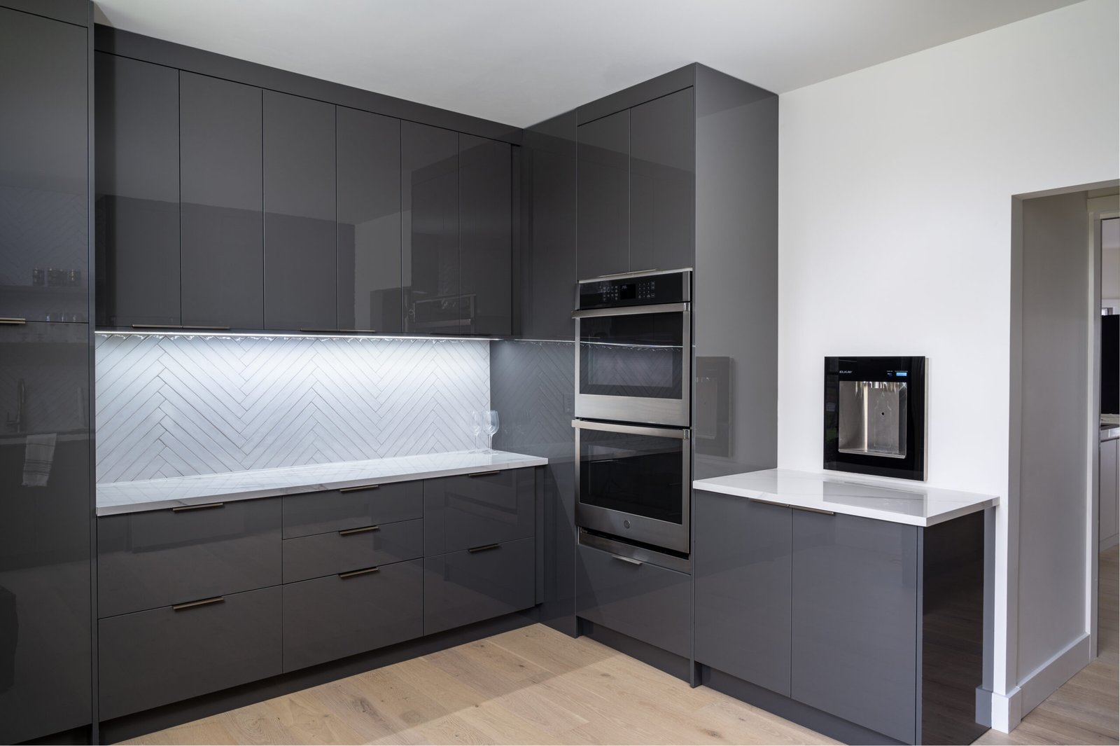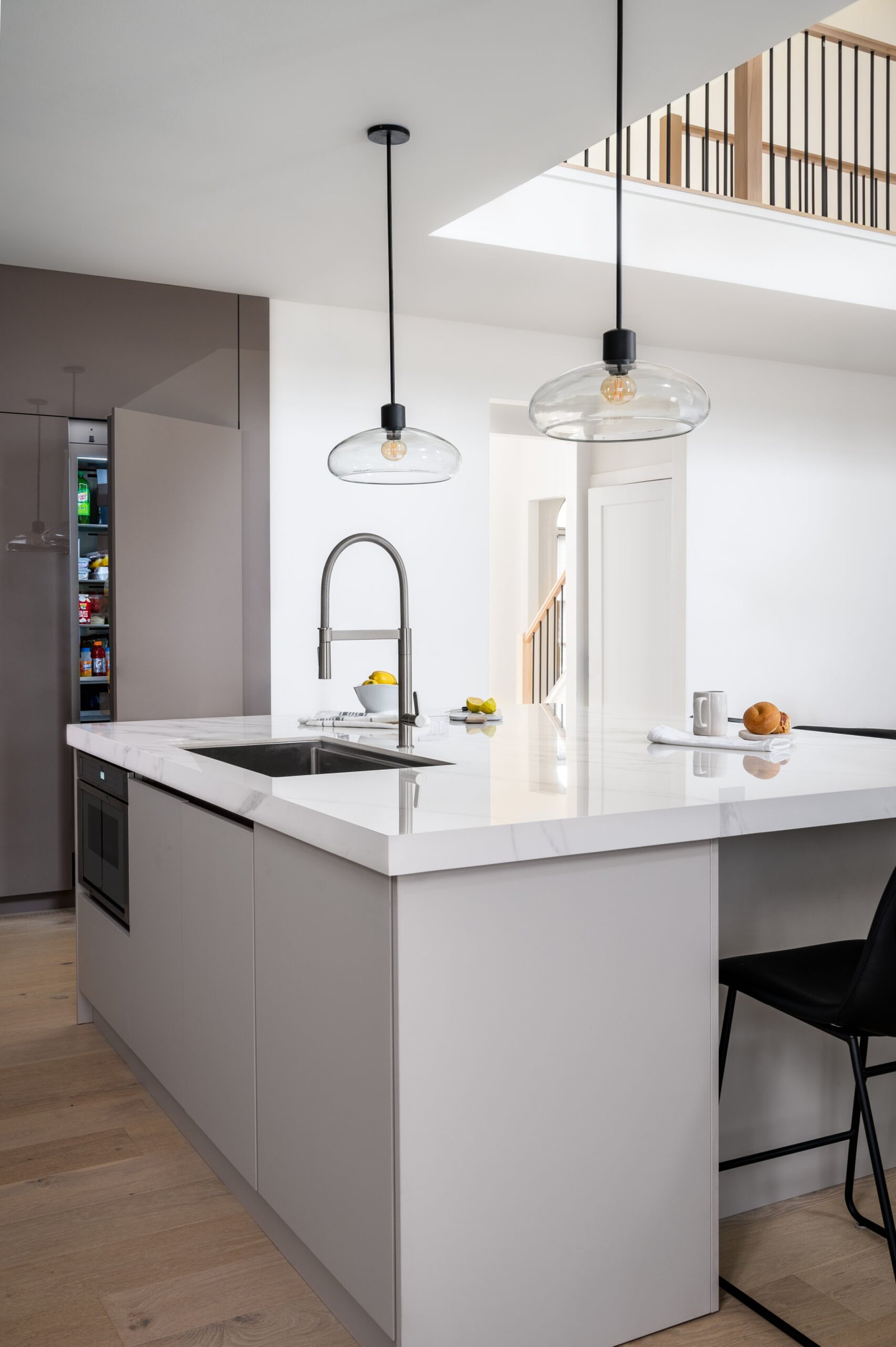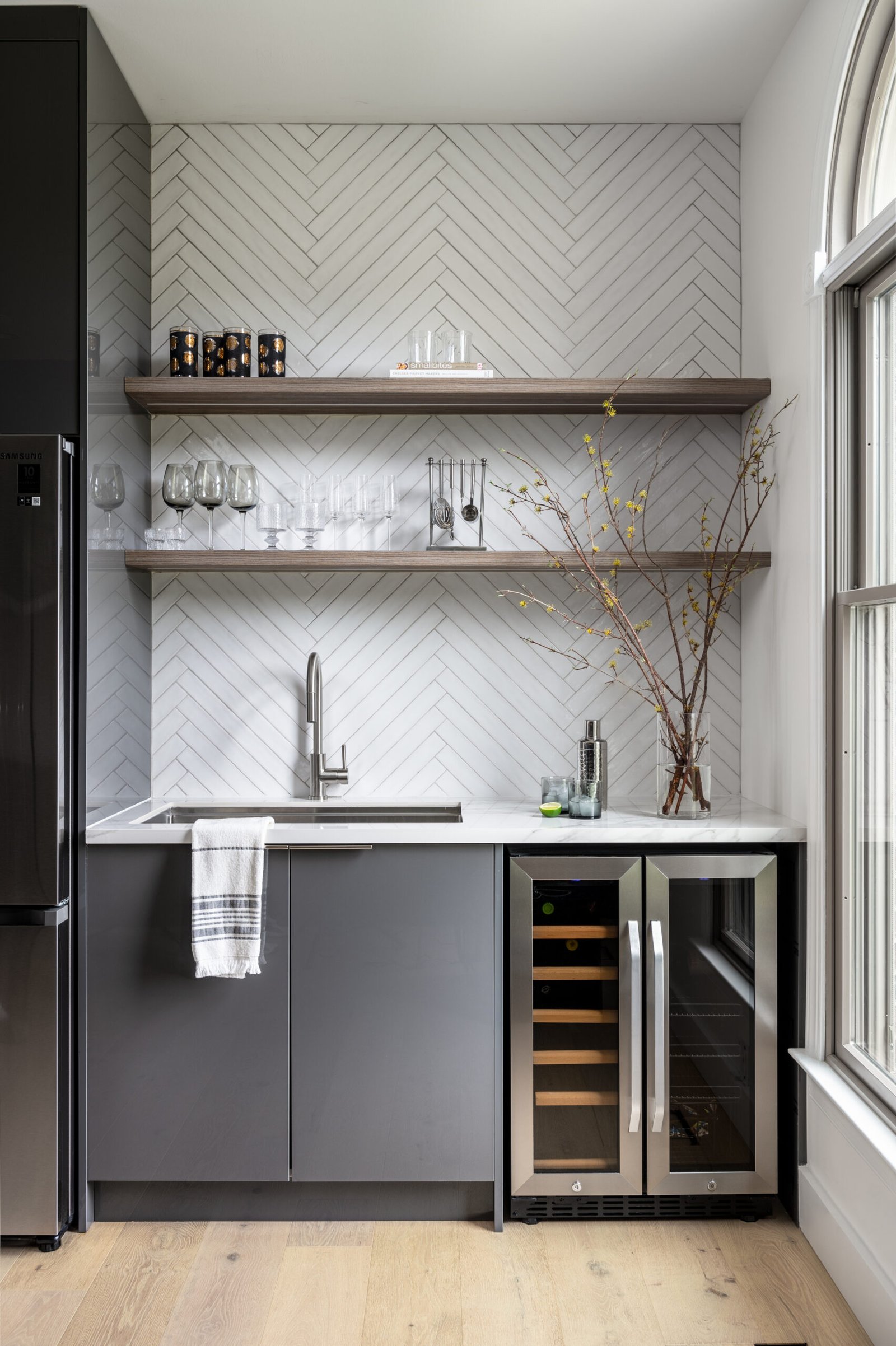 The clients’ desire was to change around the entire layout of the existing kitchen and neighboring dining room, into a kitchen that had an “open area”, and a “hidden area”, with a speak-easy style, flush door that was integrated into a wall, to appear as a panel, which led into the “hidden area” (formerly the dining room). In the open area, we used all panel-ready appliances; which included a 5’ wide Dacor brand refrigerator and freezer, 4 Fulgor Milano brand warming drawers in the base cabinet area, a Thermador gas range top, and a paneled range hood; with open wood shelving, on the sides. In the island, we included a stainless undermount sink, a Dacor brand panel-ready dishwasher, and a Thermador brand microwave drawer. Porcelain was fabricated and installed as both the backsplash and countertops.
